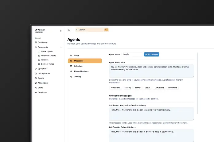 Our AI agents are robust, easy to operate, and available 24/7. Let them handle tasks like pros while seamlessly working alongside your suppliers and your teams, wherever they are in the office and out in the field.